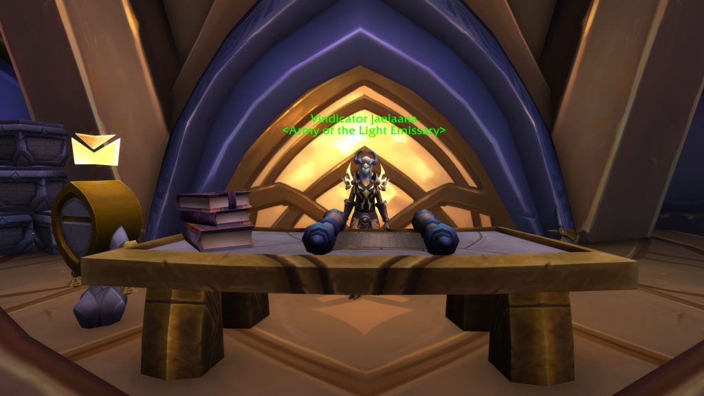 Use the Lightforged Beacon at Krasus' Landing to board the Vindicaar, then swap the navigation console to Light's Purchase before checking in with Jaelaana.